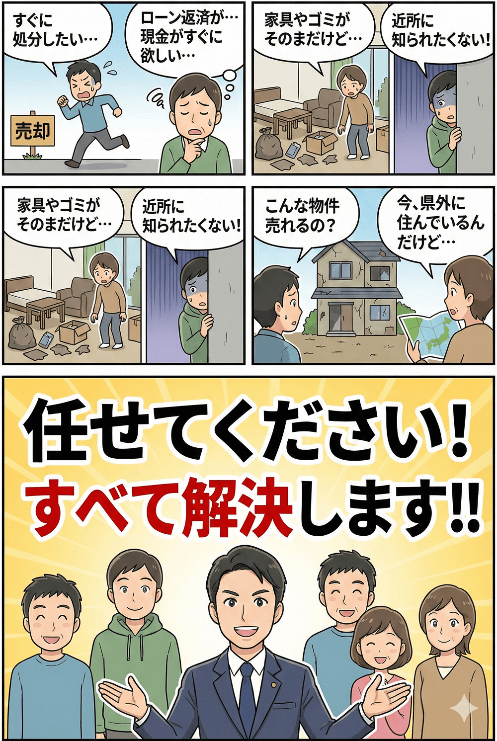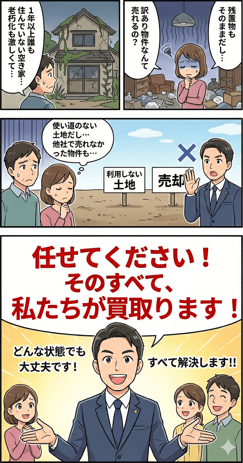 「迅速かつ公正な査定」「スムーズな手続き」「透明な取引」をお約束し、不動産買取満足度1位を目指し、